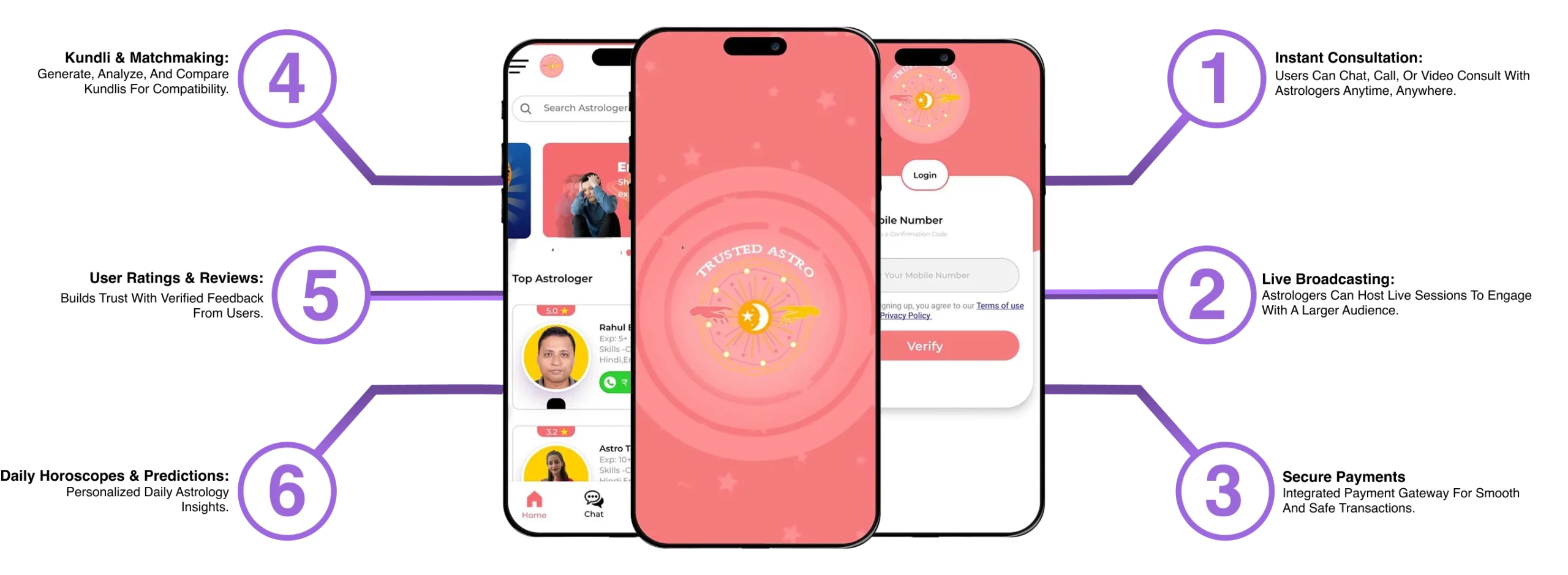Trusted Astro is a cutting-edge online astrology consultation application designed to connect users with experienced astrologers for personalized guidance. The app offers a seamless platform where users can access astrological predictions, horoscope readings, and live consultations, making astrology services more accessible than ever.